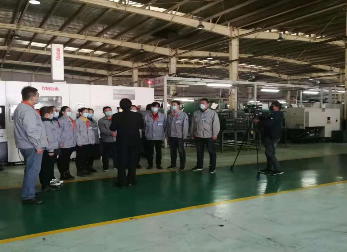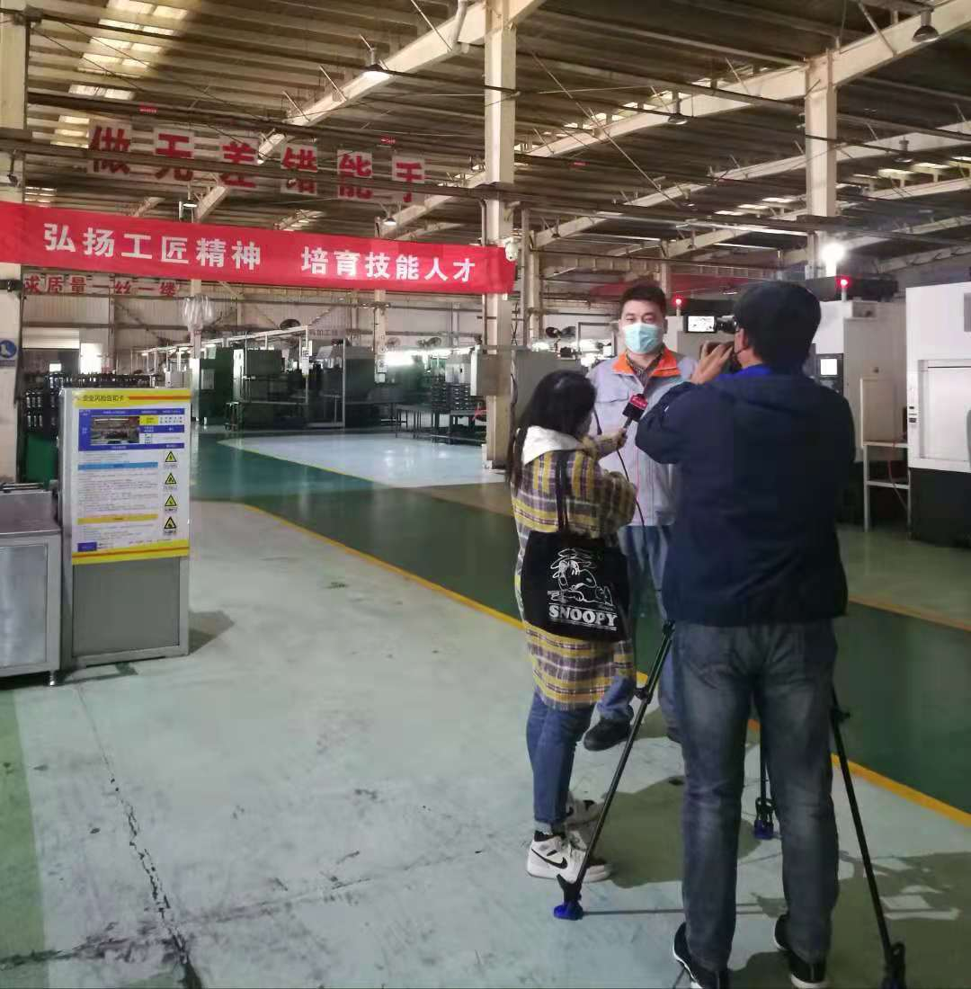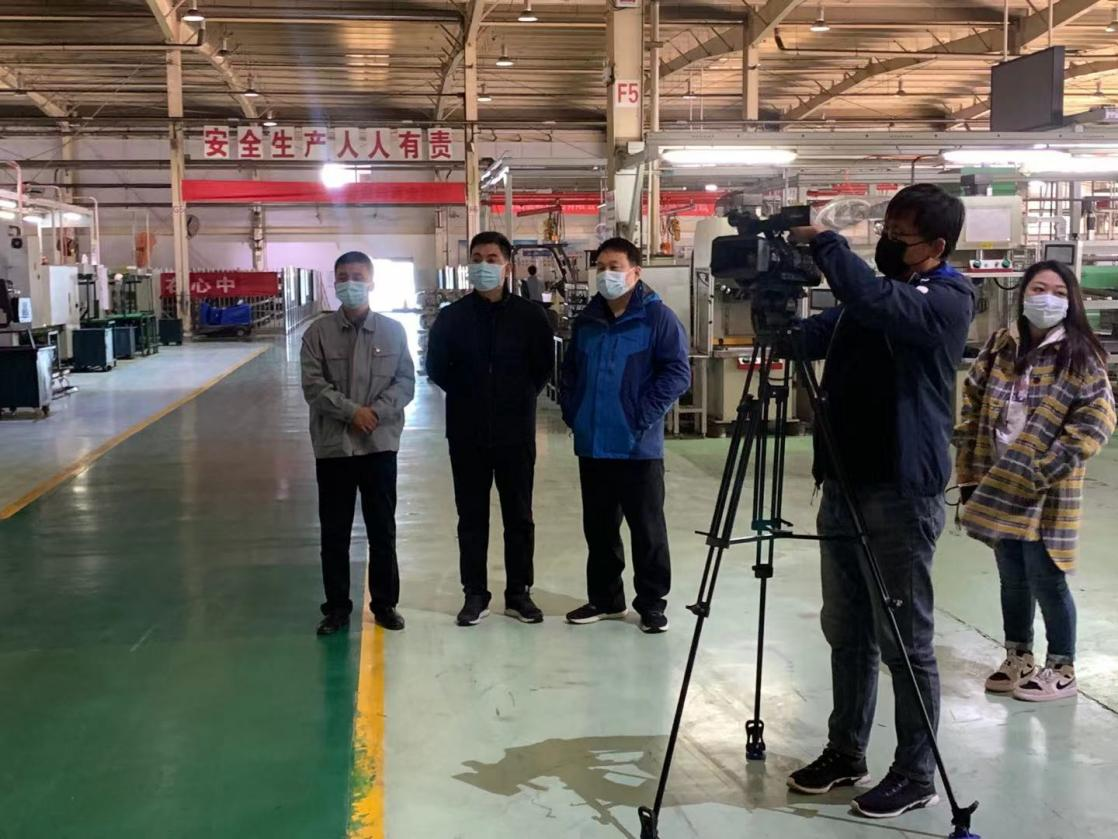 2021年11月9日上午,在唐山市人社局职建处马玉辉处长和高新区劳动监察大队刘振兴队长的陪同下,唐山电视台《唐山新闻》栏目记者王猛、魏微到半岛电子就职工职业技能提升行动进行专题采访报道。集团党委书记、董事长邢宝昌接受现场采访,向记者简要介绍了职工职业技能提升行动的开展情况和取得的成果。