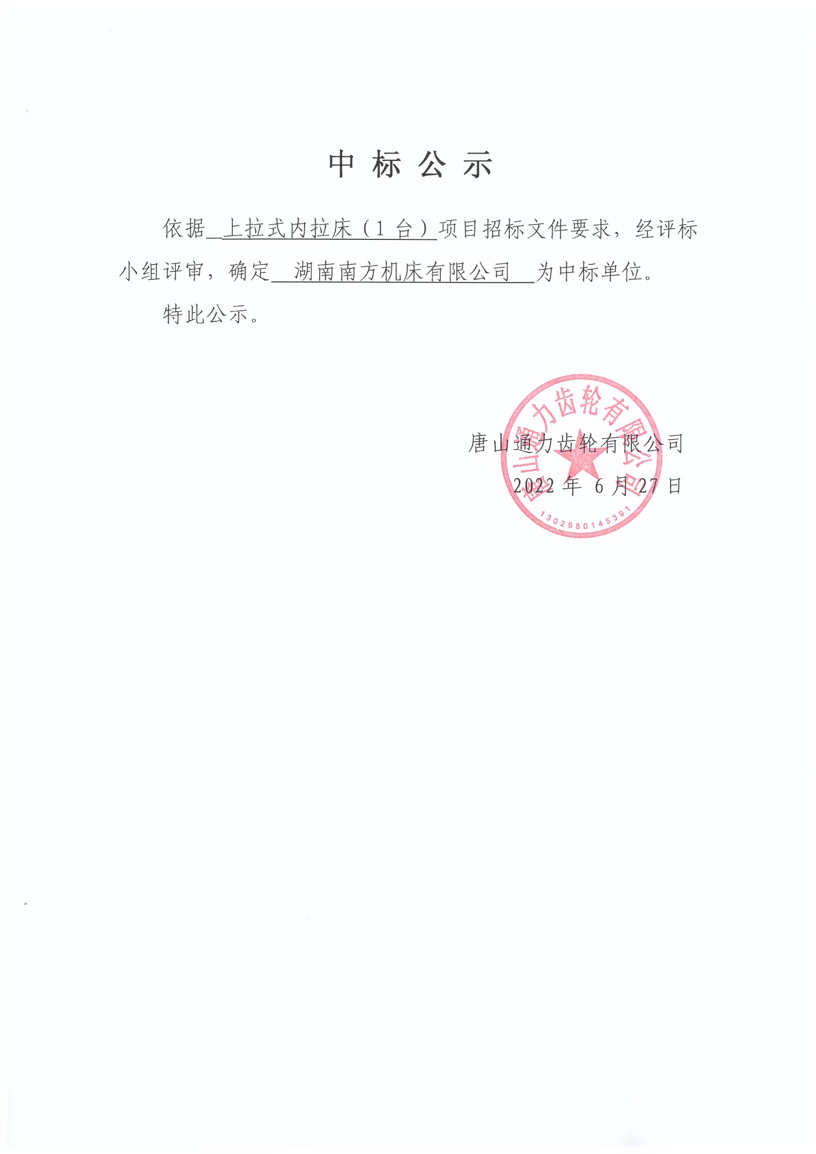 唐山通力齿轮有限公司关于上拉式内拉床(1台)项目中标公告