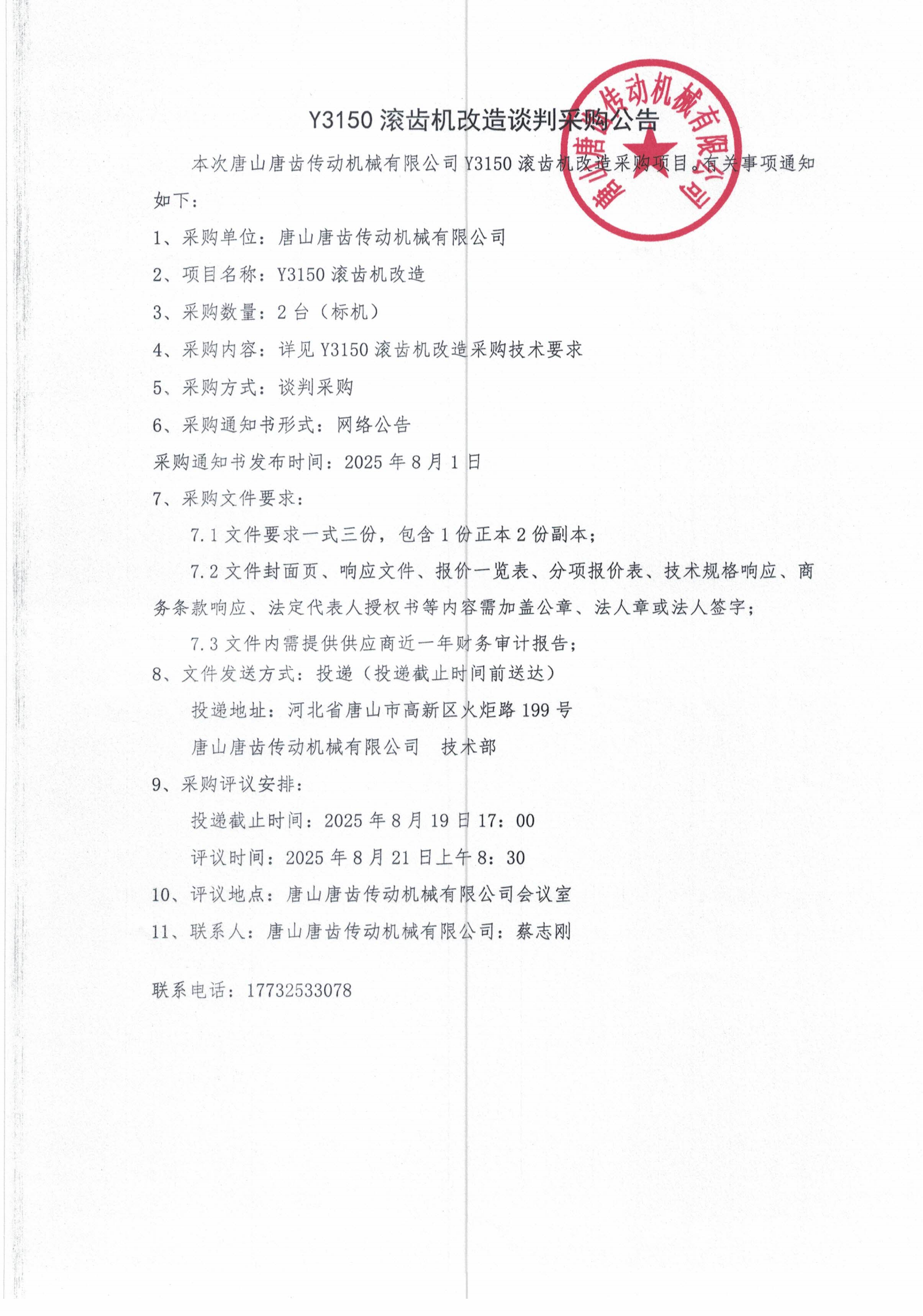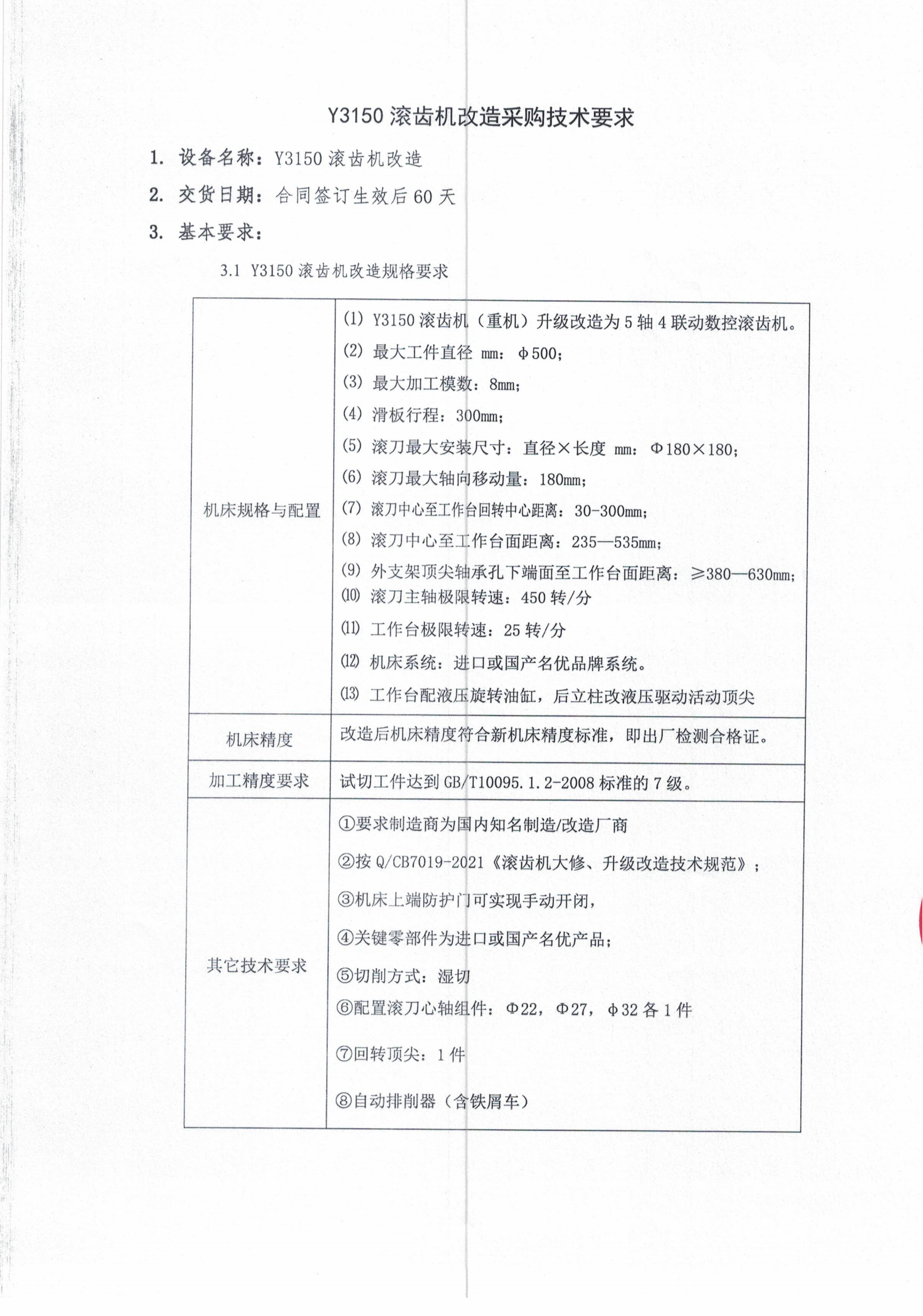 唐山唐齿传动机戒有限公司 Y3150滚齿机改造谈判采购公告